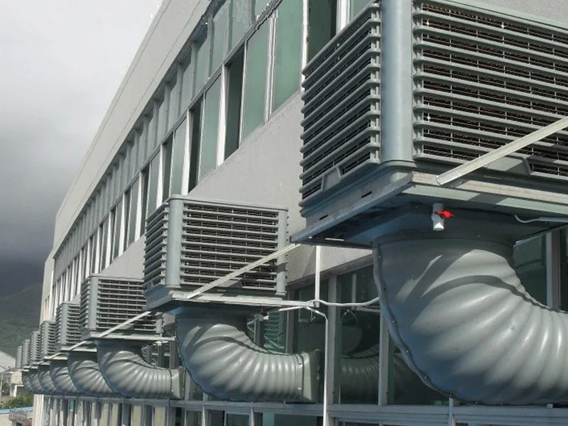En entornos de producción industrial, los ventiladores se utilizan comúnmente para eliminar gases, polvo y olores dañinos. Por ejemplo, se emplean en plantas químicas para extraer humos tóxicos o en minas para suministrar aire fresco. También ayudan a controlar la temperatura y la humedad del taller, mejorando la comodidad de trabajo, como se ve con grandes ventiladores axiales en torres de enfriamiento de plantas de acero que disipan el calor.